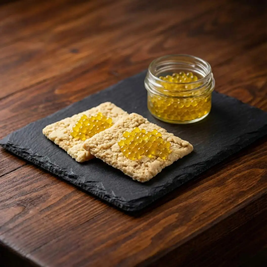 Discover the high quality Extra Virgin Olive Oil (EVOO) pearls ready for gourmet elaborations.